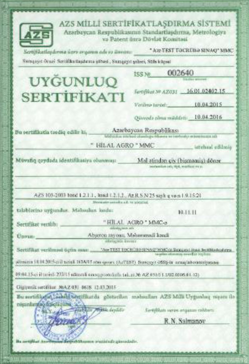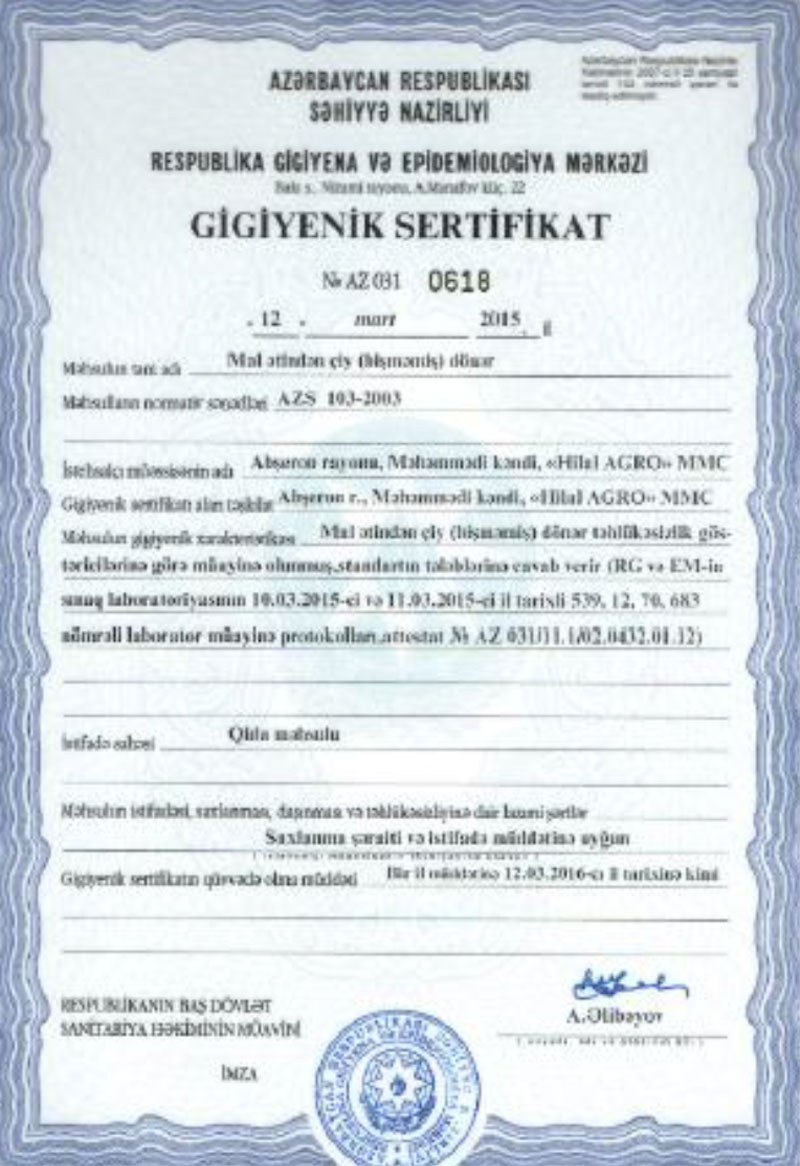 Certificate of Conformity of Hygiene by Ministry of Azerbaijan